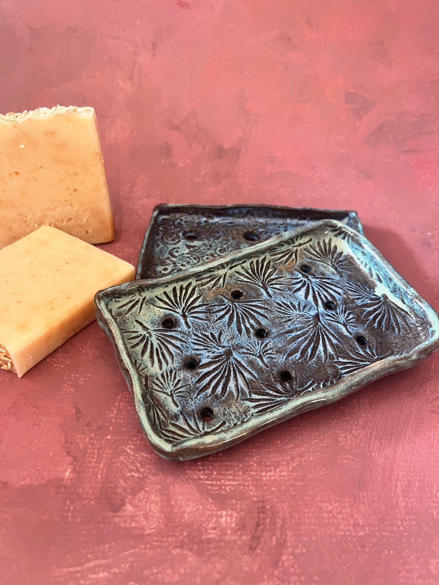 Hand made ceramic soap dish with botanical ornaments.
