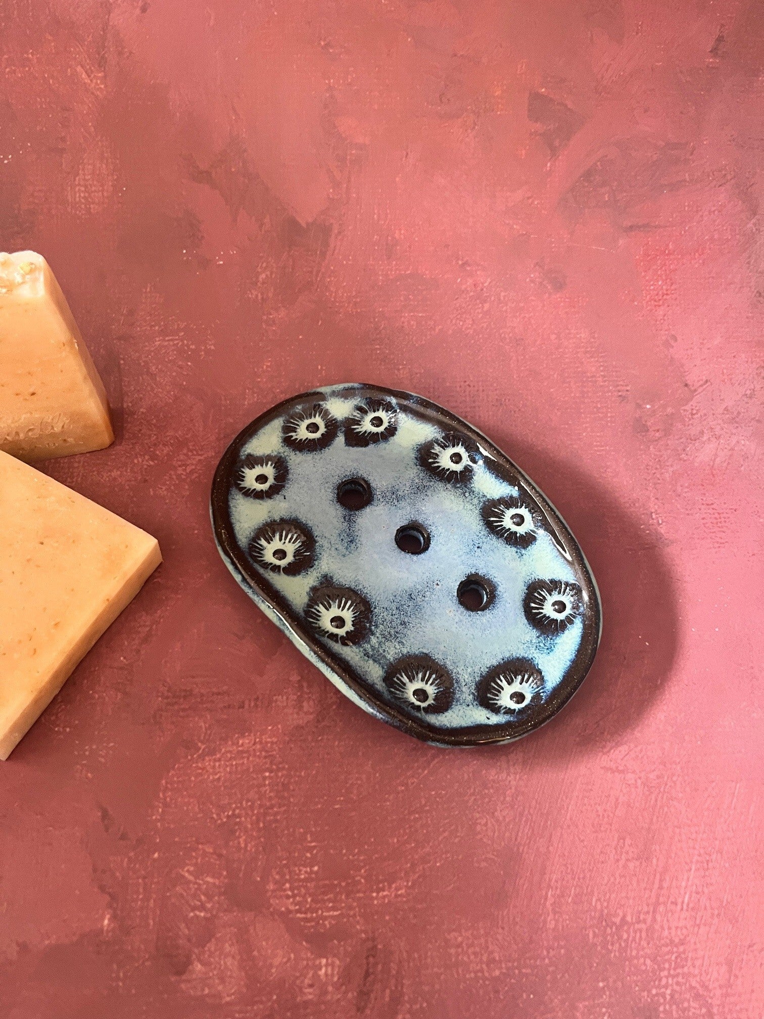Limited edition of handmade soap dishes in blue shades and flowers.